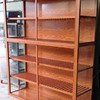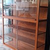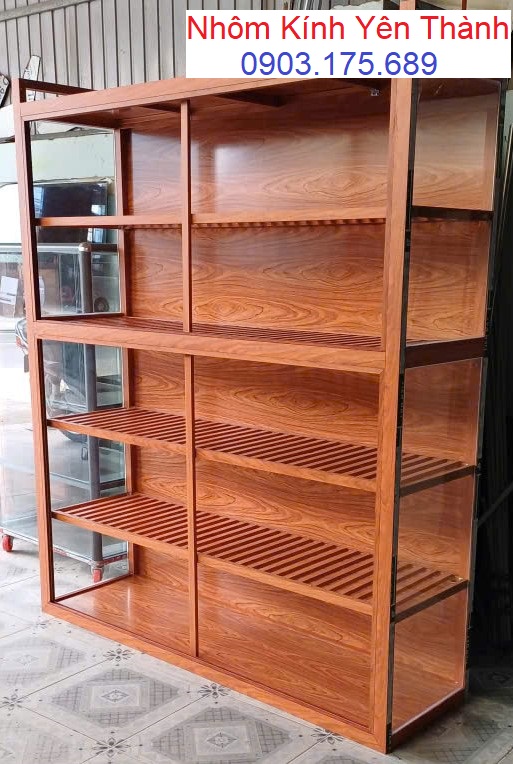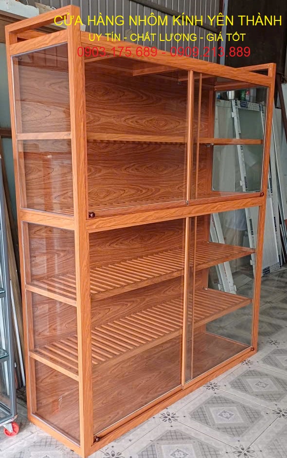 Mẫu tủ chén nhôm kính màu vân gỗ có bánh xe